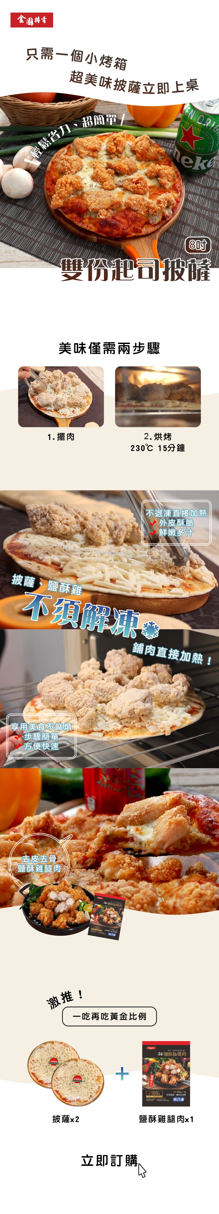 在披薩和鹽酥雞都還沒退凍之前,送進烤箱加熱230℃15分鐘,就是最完美的黃金比例啦!